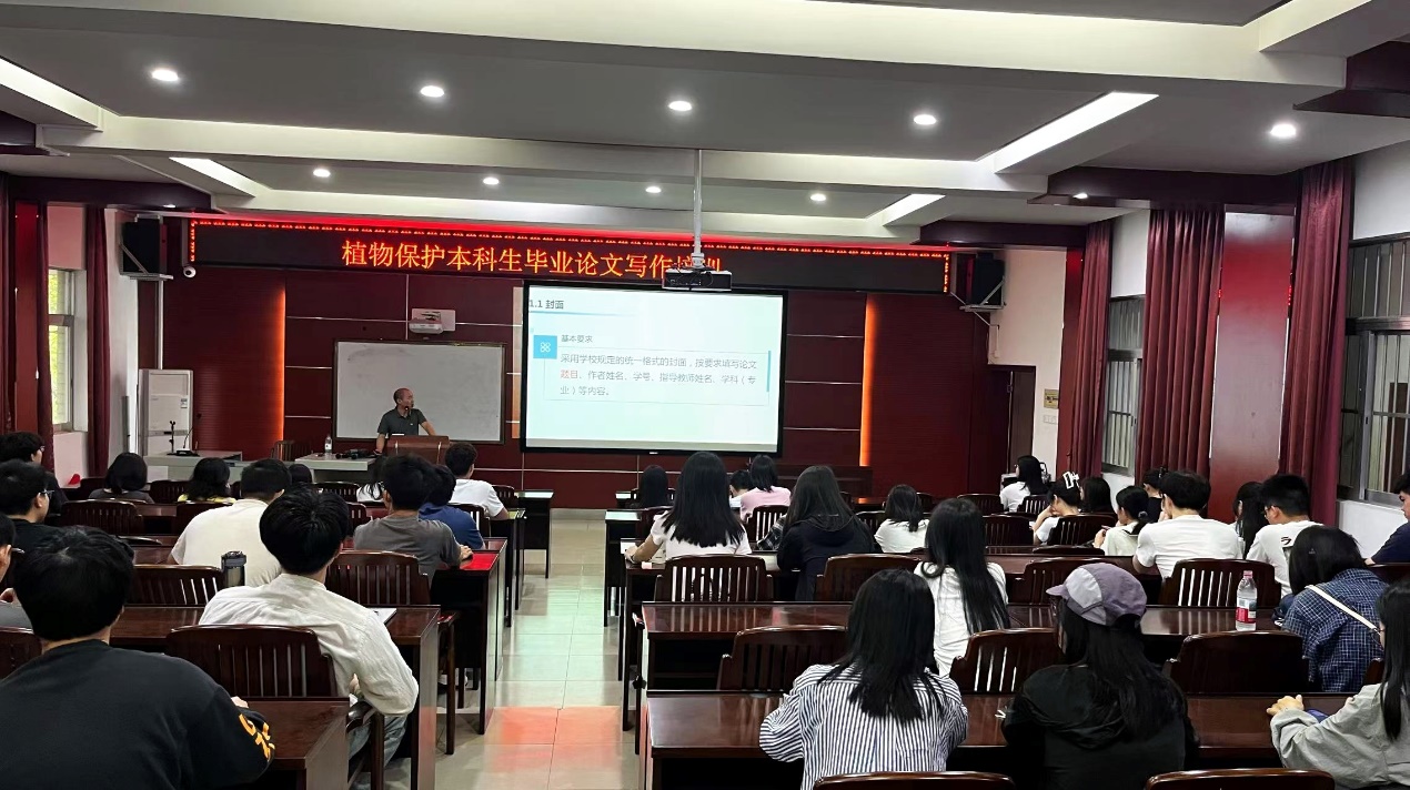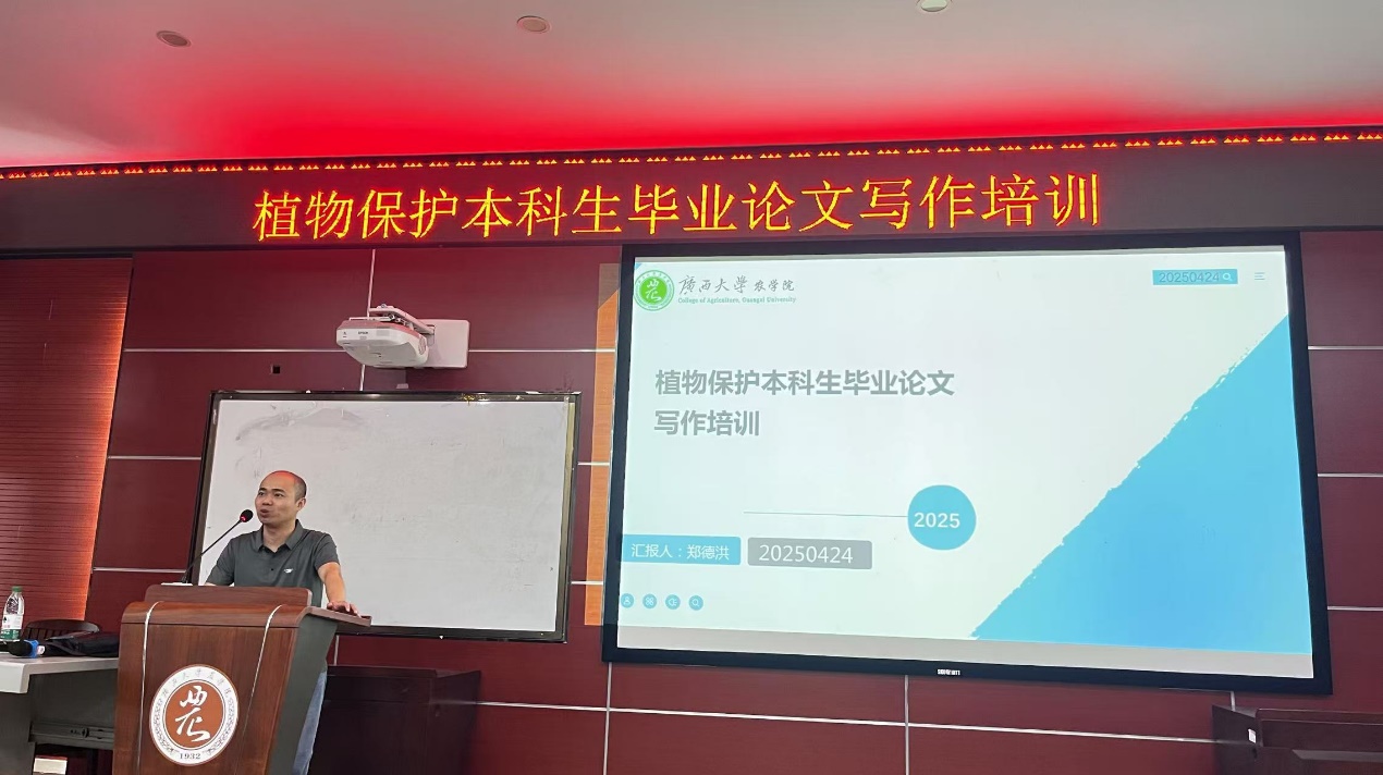 为进一步强化太阳成集团tyc151cc本科毕业设计(论文)环节的教学质量,确保2025届本科生能够高质量地完成毕业设计(论文),根据学校、学院工作安排,太阳成集团tyc151cc植物保护系于2025年4月24日在学院306多媒体教室开展了“植物保护本科生毕业论文写作培训”。主讲老师郑德洪副教授就本科毕业论文的题目、中英文摘要、前言、材料与方法、结果与分析、讨论与总结等各部分开展了详细的写作指导,并通过实例分析了毕业论文写作的规范和注意事项。最后,郑德洪老师以“数据不说谎、学术即修行、批判中成长”总结了如何写好本科毕业论文,并殷切希望同学们进入冲刺状态,认真打磨好毕业论文。
