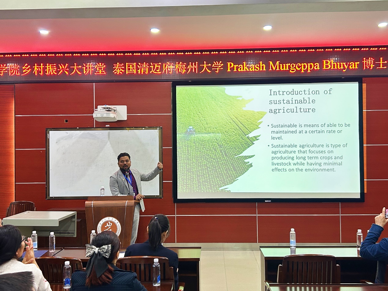 报告会上,Bhuyar博士以可持续农业为主题,对“可持续农业的原则”“可持续农业技术”“可持续农业的优势”“可持续农业的缺点”等四个方面内容进行全方位讲解。他深入浅出地介绍了可持续农业相关技术,并结合具体案例全方位展示了这些技术在可持续农业中的应用和成效。Bhuyar博士的报告内容丰富,充分展现了他扎实的学术功底与敏锐的科研洞察力,同时加深了师生们对可持续农业的理解,充分调动了在场师生学习交流的积极性。