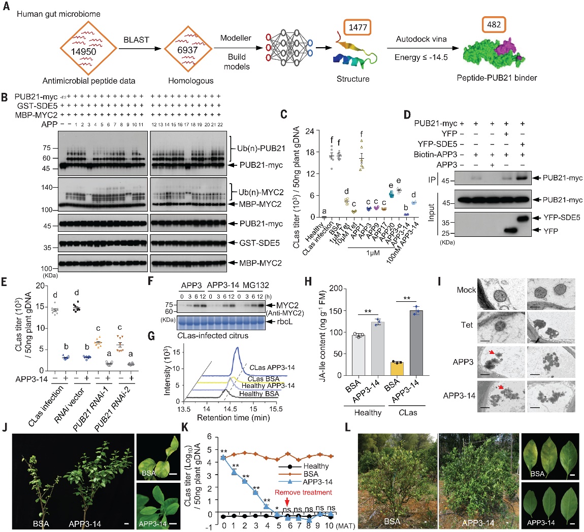 2025年4月11日,中国科学院微生物研究所叶健研究员团队在《Science》杂志以封面文章形式在线发表题为Targeted MYC2 stabilization confers citrus Huanglongbing resistance的研究成果。该研究首次系统性解析了柑橘应对黄龙病(Huanglongbing, HLB)的核心分子机制,揭示了由E3泛素连接酶PUB21与转录因子MYC2构成的抗性遗传调控网络。基于机制解析,该团队通过人工智能辅助筛选技术鉴定出双功能肽APP3-14,该小肽可特异性稳定MYC2蛋白并阻断其泛素化降解。田间验证显示,APP3-14能显著抑制黄龙病病原菌扩散,单季防控效率达80%,且对柑橘植株生长无不良影响。这一发现阐明了植物-病原互作的新模式。值得注意的是,该研究中小肽APP3-14的研发及其田间应用为黄龙病的绿色防控提供了创新性解决方案,不仅丰富了现有的防控手段,还为以小肽为核心的新一代绿色农药研发注入了强劲动力,有望加速相关领域的技术突破与产业化进程。