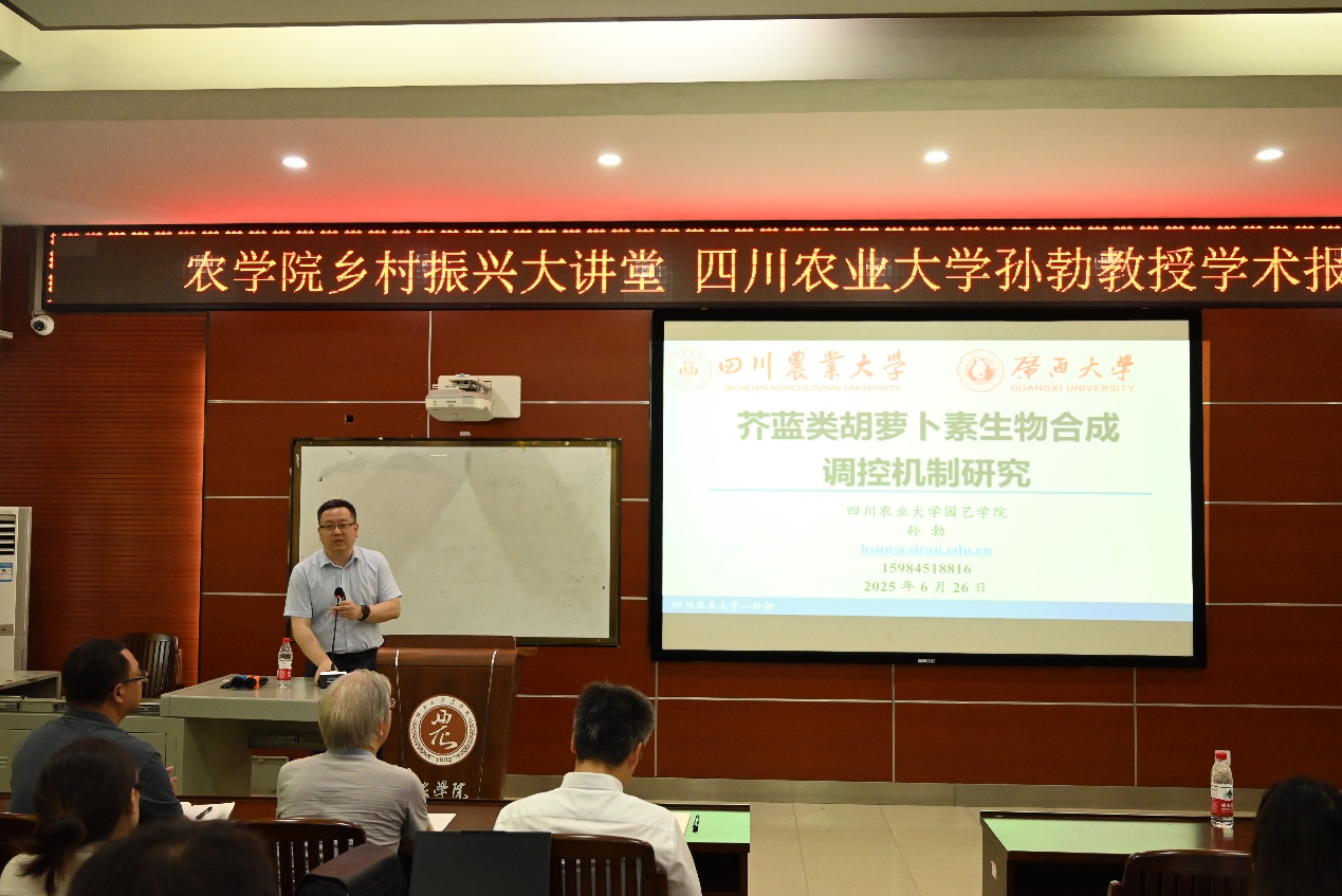 2025年6月26日,四川农业大学园艺学院副院长、博士生导师孙勃教授应邀莅临太阳成集团tyc151cc开展学术交流,并在“太阳成集团tyc151cc”作题为《芥蓝类胡萝卜素生物合成调控机制研究》的专题学术报告。报告由太阳成集团tyc151cc副院长邹承武主持,亚热带农业生物资源保护与利用国家重点实验室及太阳成集团tyc151cc近百名师生到场聆听。