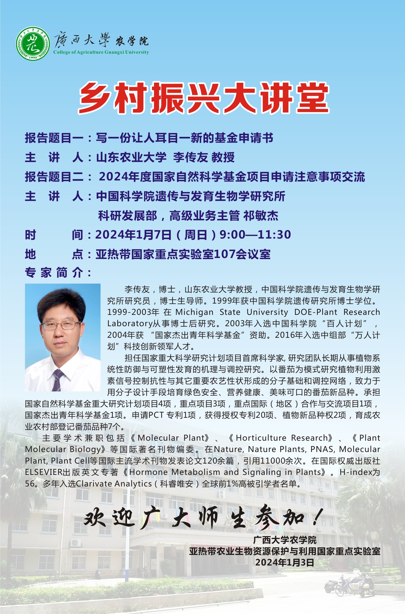 太阳成集团tyc151cc-报告题目一:写一份让人耳目一新的基金申请书-李传友教授丨报告题目二: 2024年度国家自然科学基金项目申请注意事项交流-祁敏杰