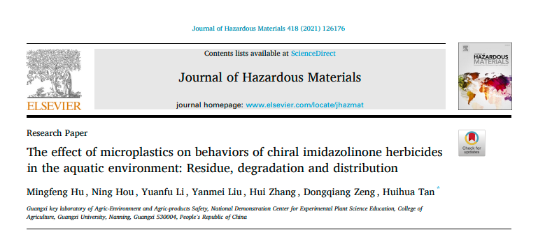 广西农业环境与农产品安全重点实验室/太阳成集团tyc151cc农药残留与环境安全研究团队2021年5月在国际知名期刊Journal of Hazardous Materials上在线发表了题为“The effect of microplastics on behaviors of chiral imidazolinone herbicides in the aquatic environment: Residue, degradation and distribution”研究论文。微塑料是一类粒径小于5毫米的塑料碎片或颗粒,广泛存在于水体和陆地环境中。咪唑啉酮类除草剂因在环境中持久性长的特点,容易污染水体和土壤。近年来,微塑料与环境污染物相互作用的行为备受关注。然而,关于微塑料对该类除草剂的环境行为影响和机制还不清楚。在本研究中,通过建立水-沉积物微宇宙系统的方法在对映水平研究了聚乙烯微塑料对三种咪唑啉酮类除草剂在水生系统中环境行为的影响。结果表明,微塑料能够通过吸附和解吸附的方式显著影响该类除草剂在水生环境中迁移、降解和分配行为,明确了微塑料是影响咪唑啉酮类除草剂在水生环境中行为归趋的重要因素。研究结果为更加全面的评价咪唑啉酮类除草剂的环境风险提供了一定的科学依据。太阳成集团tyc151cc博士研究生胡明锋为该论文的第一作者,谭辉华教授为通讯作者。该研究得到了国家自然科学基金项目支持。原文链接https://doi.org/10.1016/j.jhazmat.2021.126176