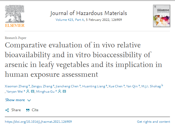 广西农业环境与农产品安全重点实验室/太阳成集团tyc151cc耕地质量与安全利用研究团队近期在国际知名期刊Journal of Hazardous Materials上发表题为“Comparative evaluation of in vivo relative bioavailability and in vitro bioaccessibility of arsenic in leafy vegetables and its implication in human exposure assessment”研究论文。叶菜类蔬菜中的砷已经成为人体摄入砷的主要来源之一,因此科学准确地评估蔬菜中砷经口暴露对人体的健康风险尤为重要。砷生物有效性是人体健康风险评估的重要因子。但可获得生物有效性的动物模型试验花费高、耗时,不能满足大批量样品的测试需求。因此,建立科学可靠的预测模型,以快速准确地预测我国叶菜类蔬菜中砷的生物有效性,对准确评价叶菜类蔬菜中砷暴露引起的人体健康风险具有重要的理论和实践指导意义。本研究采用大鼠动物模型准确地测定所选蔬菜的砷相对生物有效性,通过建立体内体外相关性模型,明确了PBET (Physiologically Based Extraction Test)体外方法对叶菜类蔬菜砷人体生物有效性的预测能力最佳。并应用此模型预测不同种类蔬菜中砷的生物有效性及其健康风险。研究结果为更加全面的评价蔬菜中砷的人体健康风险评价提供了一定的参考。