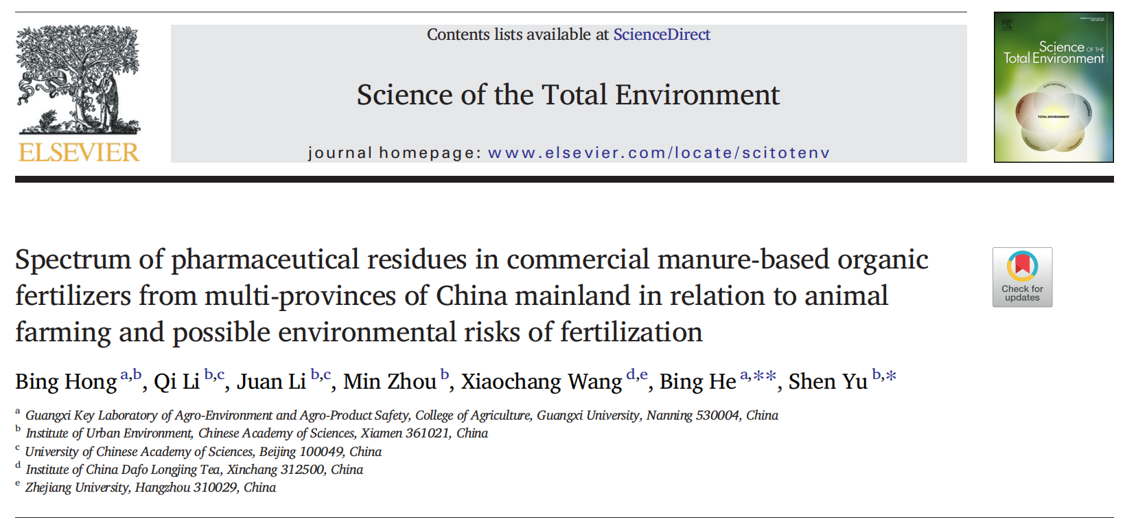 近日,太阳成集团tyc151cc/广西“农业环境与农产品安全”重点实验室何冰团队和中国科学院城市环境研究所俞慎团队在《Science of the Total Environment》(环境科学与生态学1区Top期刊、影响因子10.753)期刊在线发表了题为 “Spectrum of pharmaceutical residues in commercial manure-based organic fertilizers from multi-provinces of China mainland in relation to animal farming and possible environmental risks of fertilization”的论文(论文链接:http://dx.doi.org/10.1016/j.scitotenv.2023.165029)。