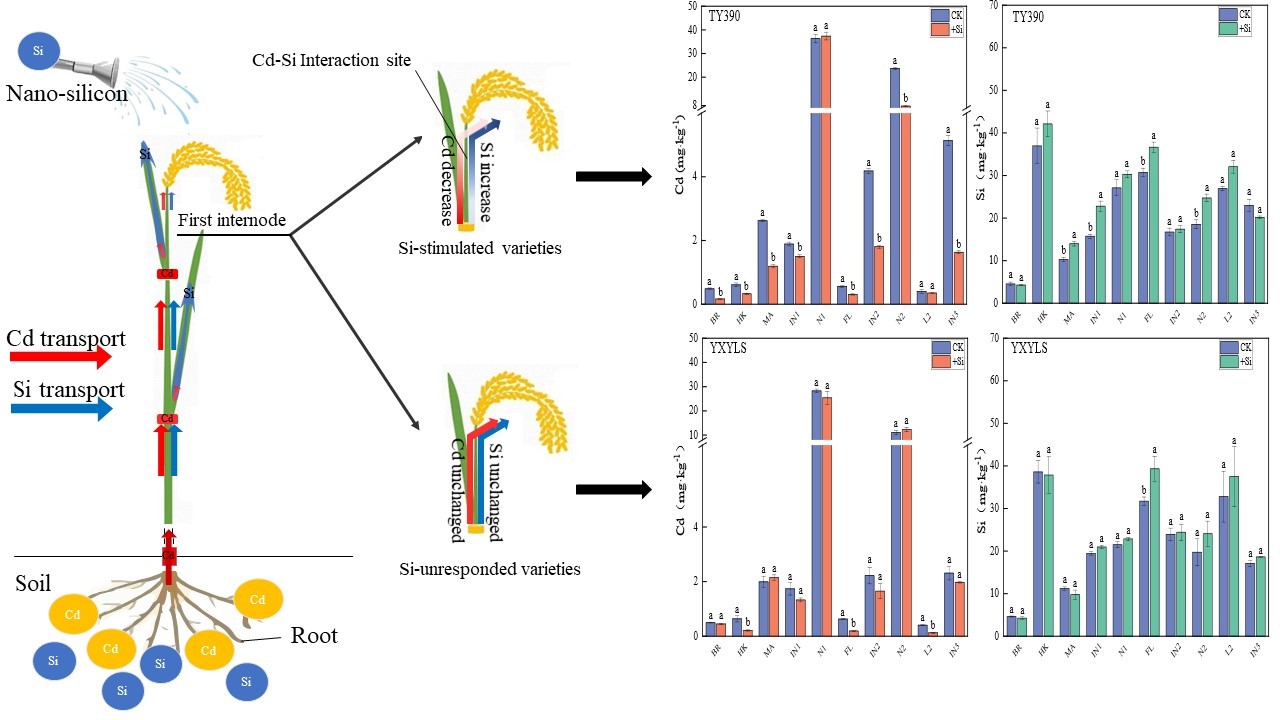 Cd是毒性最大的重金属之一,而稻米是人类摄入Cd的重要来源。目前通过叶面喷Si降低稻米Cd含量,已成为中国Cd污染稻田安全利用的主要措施技术之一。何冰团队通过大田实验研究了叶面施Si后4个水稻品种Si和Cd的运输和积累规律,发现第一节间是施硅抑制型水稻Si和Cd互作的关键部位,其中OsZIP7是水稻对Si响应的关键Cd转运蛋白之一。研究结果揭示Si抑制水稻Cd向上运输的生理机制,为水稻的安全生产以及叶面阻控剂的推广应用提供重要的参考。相关结果于2023年6月在线发表于环境科学类期刊《Journal of Hazardous Materials》。广西“农业环境与农产品安全”重点实验室、太阳成集团tyc151cc为第一署名单位。