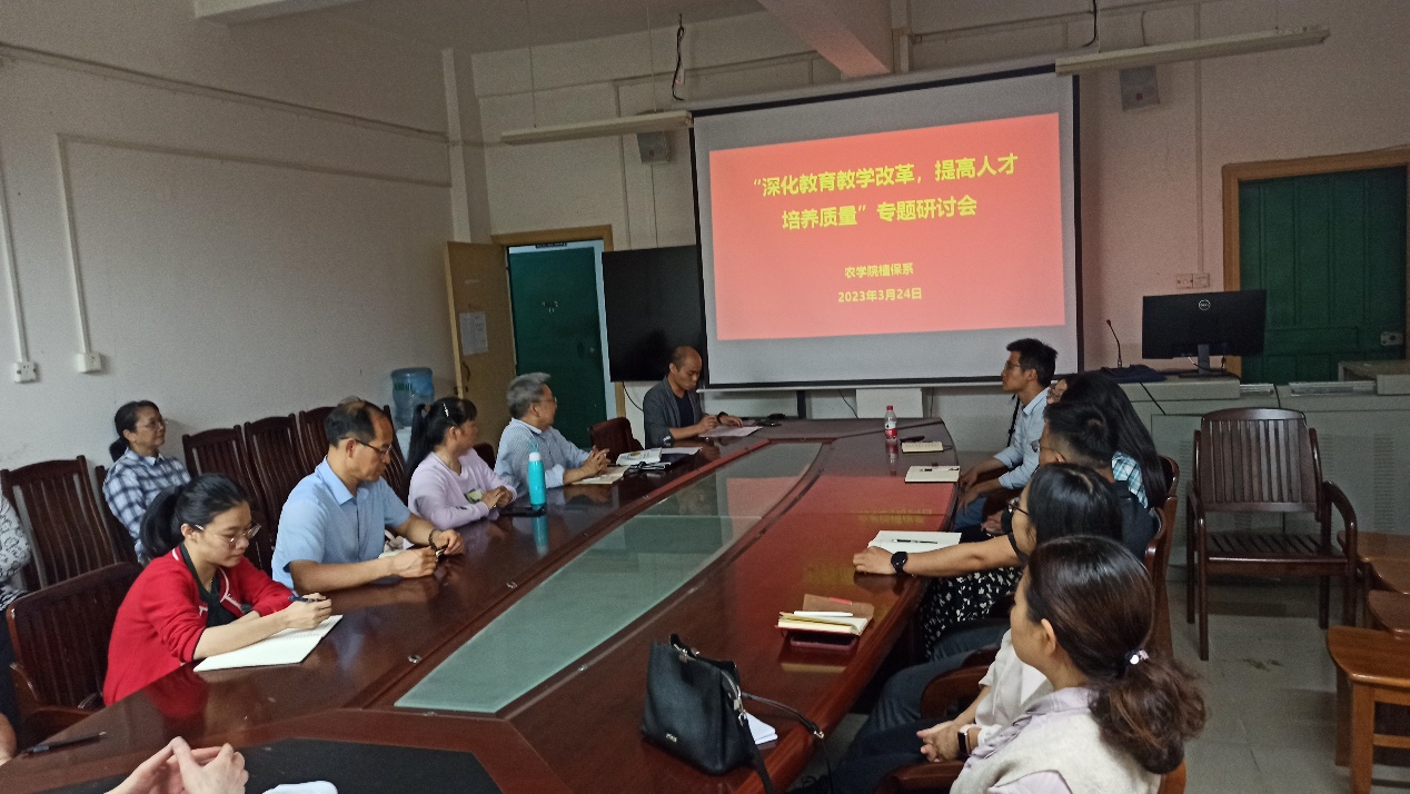 2023年3月24日,太阳成集团tyc151cc植物保护系在学院152召开“深化教育教学改革,提高人才培养质量”专题研讨会。本次会议由植物保护系副主任郑德洪副教授主持,植物保护学科带头人陈保善教授、植物保护系主任谭辉华教授、以及植物保护系全体教师参加会议。