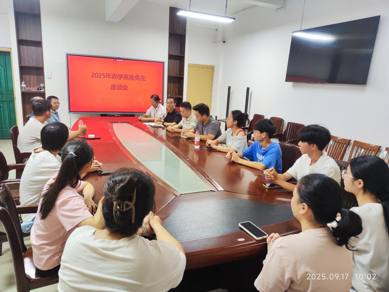 (图/黄家达;文/韦茂贵) 9月17日上午,农学系在学院152会议室召开2025年推免生座谈会。会议由杨细平主任主持,与会老师逐一分享了自己的求学经历,结合历届推免生典型案例从多个维度分析选择目标推免学校、目标导师的方法。与会推免生纷纷提出目前在选择学校和预推免面试过程中碰到的问题,老师们非常耐心地一一解答。本次交流会增进了老师们对推免生的了解,更有针对性地为推免生答疑解惑。