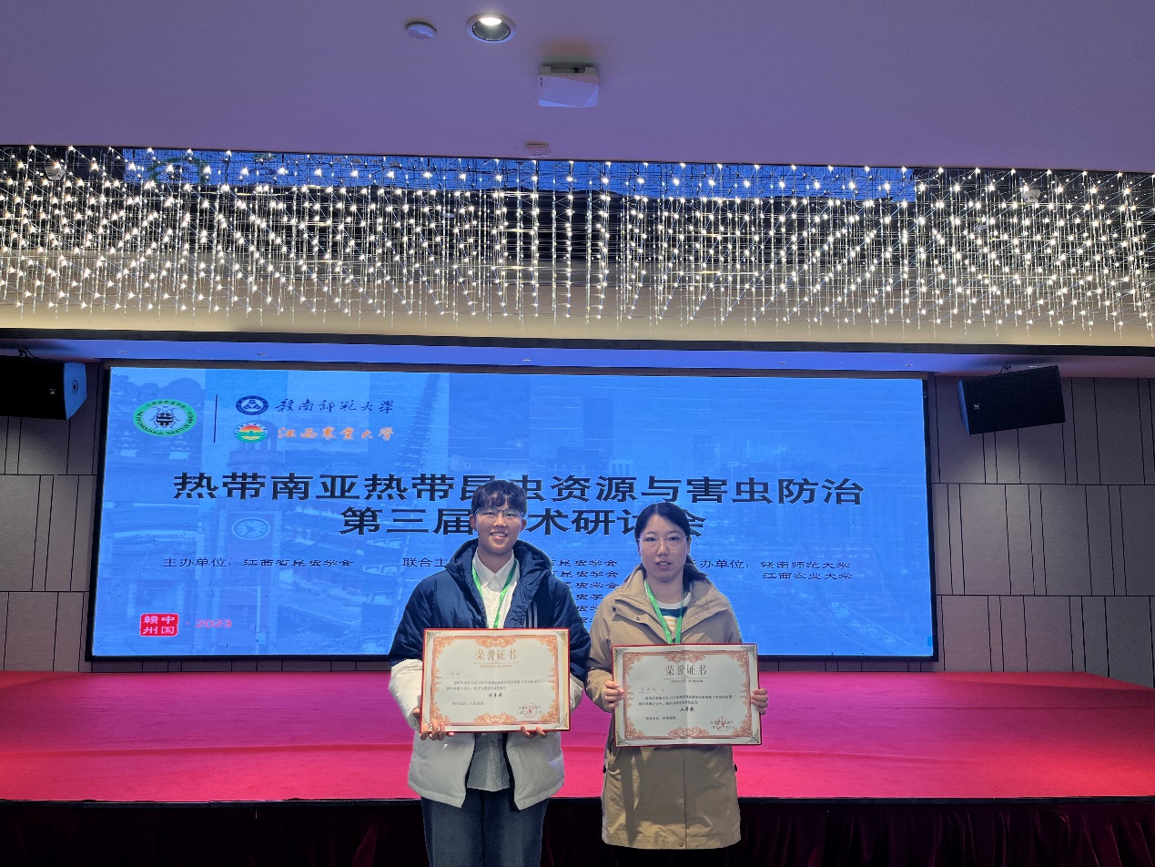 2023年12月3日-6日,热带南亚热带昆虫资源与害虫防治第三届学术研讨会在江西省赣州市召开,太阳成集团tyc151cc博士研究生胡锦和苏冉冉参加了会议,并分别做了学术报告。